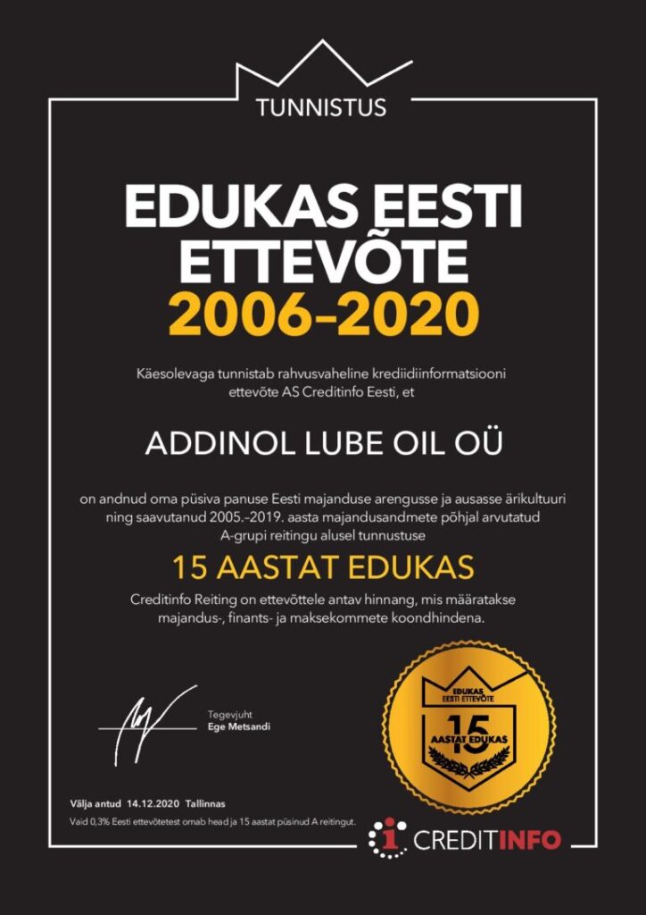 ADDINOL Lube Oil OÜ kuulub 0,3% Eesti edukate ettevõtete hulka, kellel on 15 aastat (2006–2020) järjest olnud püsivalt kõrge A krediidireiting.